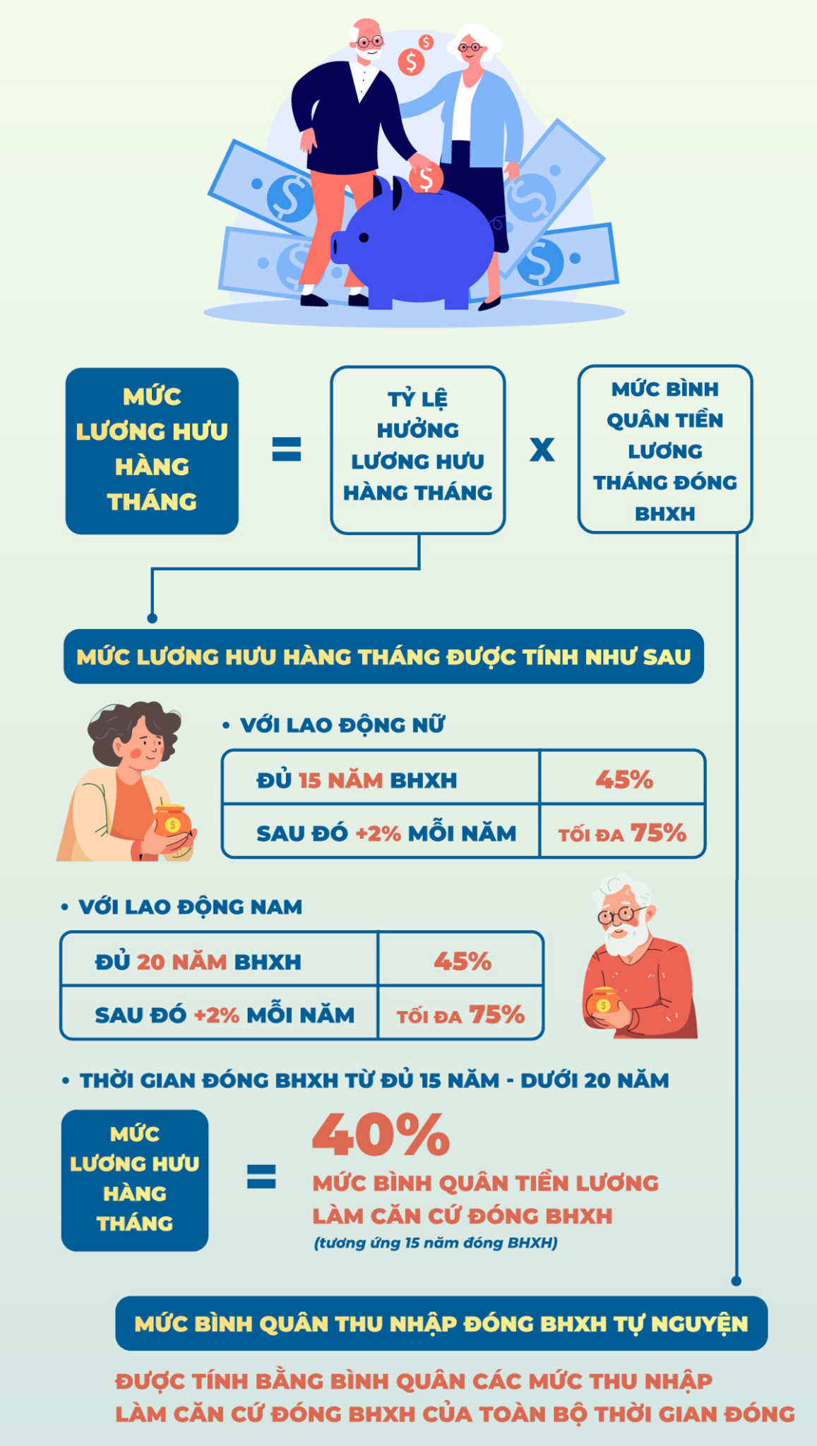 2024年社会保険法(2025年7月1日以降有効)第66条第1項b号に基づいて、社会保険加入期間が15年以上20年未満の男性従業員の年金給付額の計算方法が追加された。詳細はこちらをご覧ください。